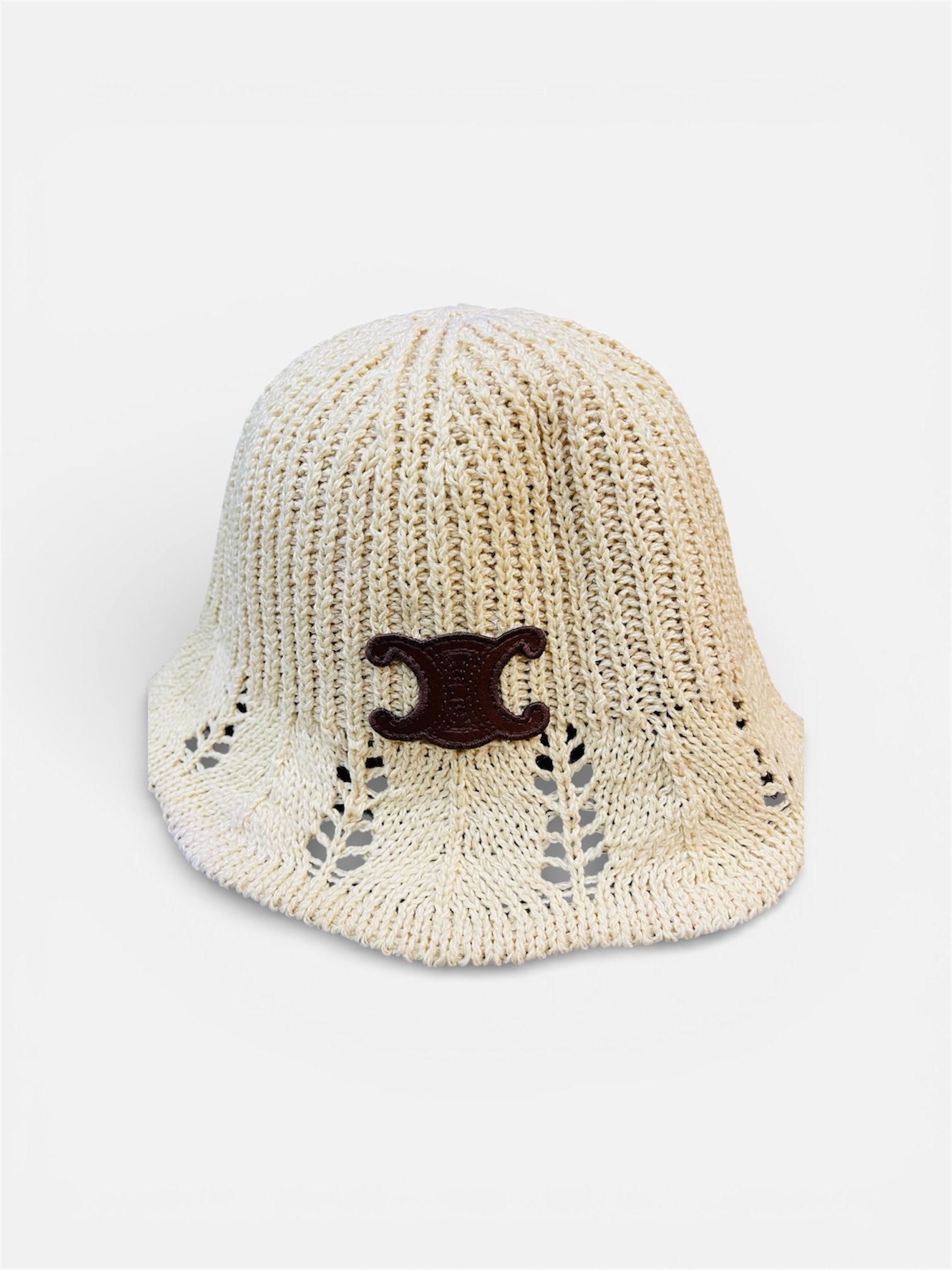 THIS ITEM IS A CELINE WOMEN’S NATURAL TRIOMPHE BUCKET HAT FEATURING A RAFFIA STYLE CROCHET CONSTRUCTION AND A LEATHER TRIOMPHE EMBLEM